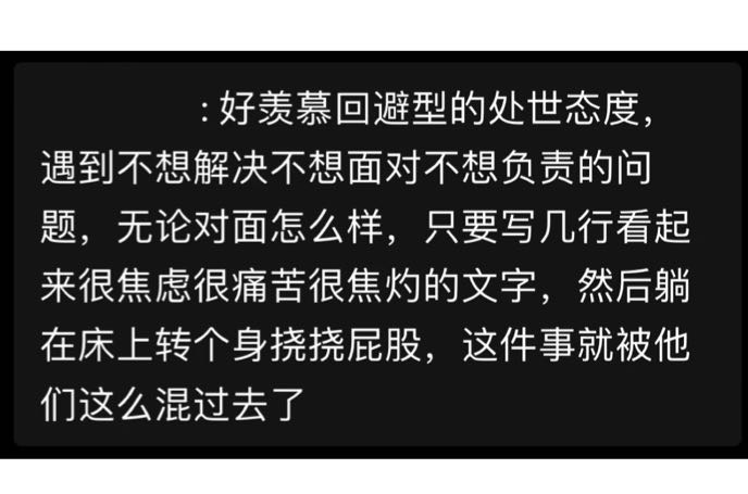 咱先瞅瞅这张图里的内容,这哪是什么“回避型处世态度”,分明就是个别人打着“回避型”的旗号,干着逃避责任的勾当。遇到问题,他们不想解决、不敢面对、不愿负责,就靠几行看似焦虑痛苦的文字,蒙混过关,自己倒还觉得挺得意。这哪是回避型人格啊,分明就是“戏精”上身。今天,咱就来好好说说,这到底是怎么回事。